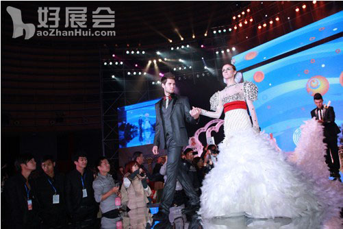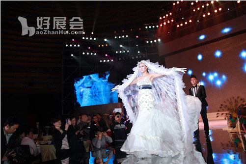 12月7日晚上,在會議閉幕式上,舉辦了2012春展婚禮婚紗潮流趨勢發(fā)布會,由專業(yè)模特穿著各種新款婚紗在業(yè)界同仁面前作了展示。廣西永恒集團還投入百萬巨資,選用真人布置實景,作了一場婚慶典禮的表演,讓參會的代表們領略了時尚婚禮、潮流裝飾的風采,也引領業(yè)界將婚紗攝影與婚慶典禮、喜宴服務結婚起來,為滿足人們?nèi)罕姴粩嗵岣叩奈镔|文化需求作出貢獻。