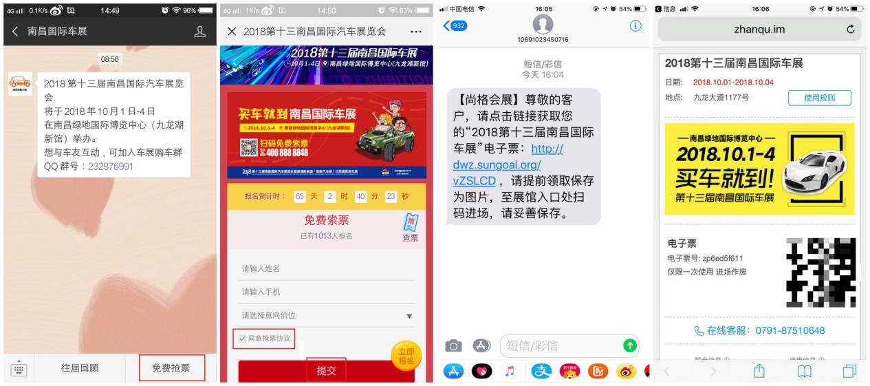 關(guān)注“南昌國際車展”微信號,點(diǎn)擊下方【免費(fèi)搶票】進(jìn)入頁面提交信息即可。官方客服電話回訪核對信息后,電子門票直接發(fā)送到您的手機(jī)上,點(diǎn)開鏈接查看電子票;入場前可以進(jìn)入官方微信【南昌國際車展】點(diǎn)擊菜單【票證查詢】進(jìn)入查詢頁面即可打開電子票圖片;